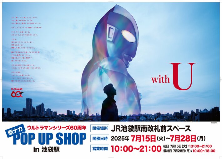 JR池袋駅南改札前スペースにて、7/15(火)~ 7/28(月)の期間「ウルトラマンシリーズ60周年 駅ナカ POPUP SHOP in 池袋駅」イベントが開催。「ウルトラマンシリーズ60周年」プロジェクトスタートを記念した「ウルトラマンシリーズ」のPOP UP SHOPとして各参加メーカーが多数の商品の販売を行います。