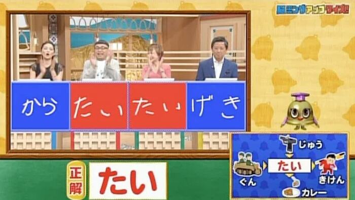 正解は「たい(軍隊・渋滞・大気圏・タイカレー)」。イジリーさんと後藤さんが正解!