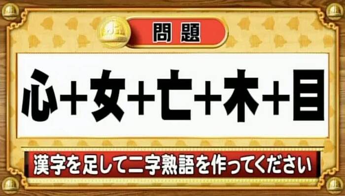 肝心の問題のヒントを一つ。「心」「女」をどう使うかがポイントになりそう。正解とは別の漢字も浮かび上がってくるので、要注意です。
