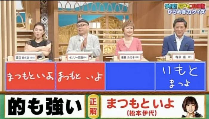 正解は「まつもといよ(松本伊代)」。渡辺さん、イジリーさんが正解!