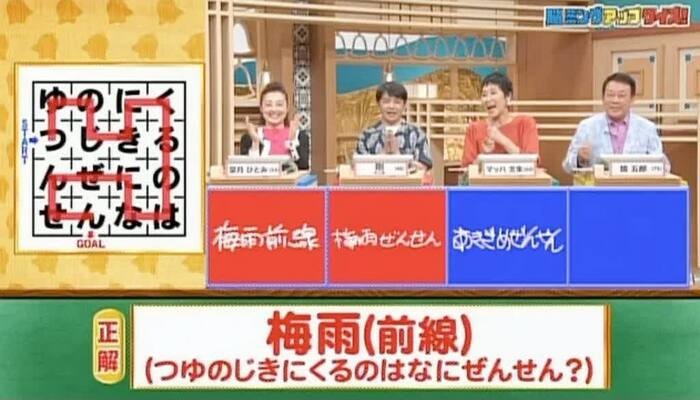 正解は「梅雨前線(つゆのじきにくるのはなにぜんせん?/梅雨の時期に来るのは何前線?)」。菜月さん、剛さんが正解!