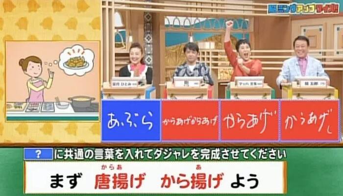 正解は「からあげ(まず唐揚げから揚げよう)」。剛さん、マッハさん、鏡さんが正解!