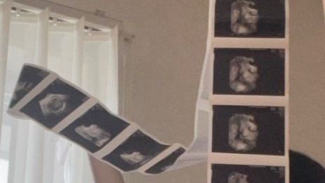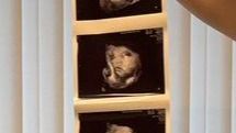 お母さんは、両手を使ってエコー写真を持っていますが、あまりの長さのためか、途中で折らないと見せられない状態になっていました。