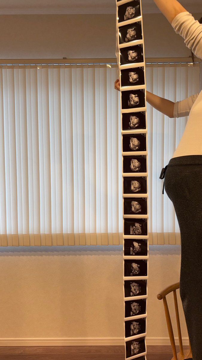 天井の高さまで伸びた15枚以上のエコー写真が!椅子に乗って撮影していますが、見切れているところも。