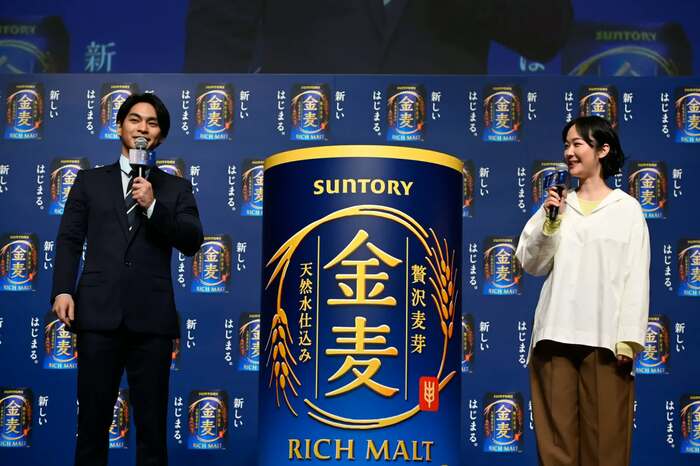 2月24日、サントリービール「金麦」新CM発表会が行われ、CMキャラクターを務める柳楽優弥さん、黒木華さんが登場しました。