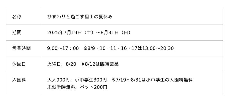 夏休み期間中(7/19~8/31)、中学生以下のお子様は入園料が無料となります。お子様はインフォメーションにて、「ひまわりすくい」が1回無料!ご家族皆様で気兼ねなく、里山の豊かな自然とひまわり畑の絶景をお楽しみいただけます。