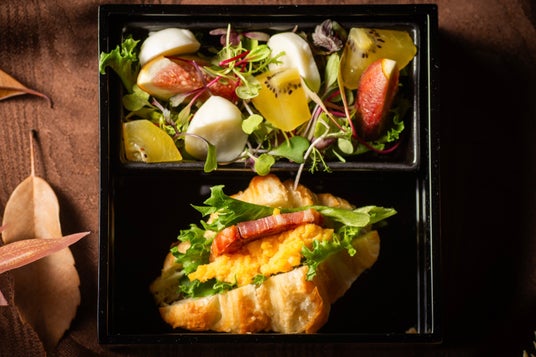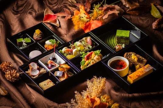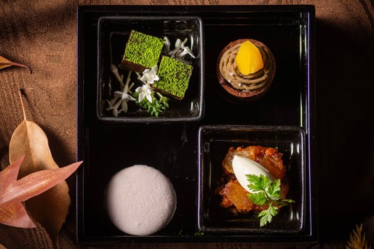 「季節の段」、「枯山水の段」「八坂の塔の段」、2つの「おばんざいの段」からなる五段重は、それぞれテーマに合わせた内容になっています。そのなかでも「季節の段」は旬の食材を使った段で、見た目も秋らしい色合いの「林檎タルトタタン」、「バイオレットマカロン」、一口サイズで口の中に秋が広がる「栗とほうじ茶のモンブラン」、京都らしく抹茶を贅沢に使用した「抹茶の生チョコレート」が宝石箱のように揃います。