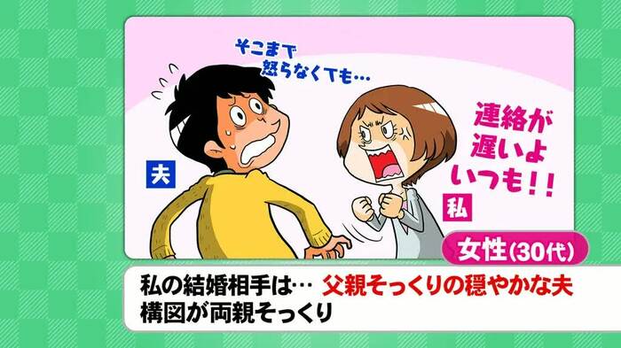「母は気が強いタイプで、父は穏やかなタイプ。自分が選んだ結婚相手も穏やかなタイプで、喧嘩の構図が両親ソックリに…」という、30代女性のエピソードも。