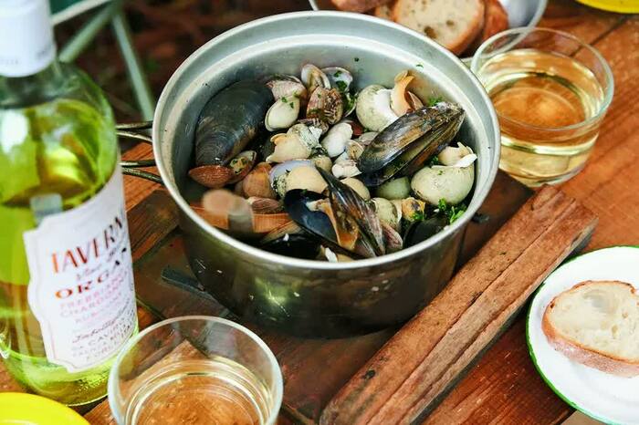 これは、鍋にお好きな貝を入れて白ワインで煮るだけ!簡単なのに、リッチな気分も味わえるのだ。この料理に合わせるお酒は、「やっぱり白ワインがいいと思いますよ」と。(※作り方は、本書をチェック!)