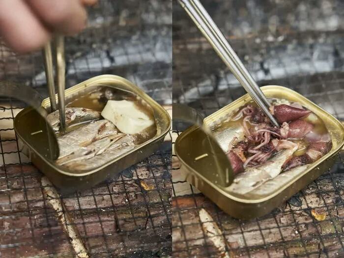 1.オイルサーディン缶のフタを開け、焼き網またはフライパンに乗せて火にかける。ふつふつとしてきたらバターを乗せ、溶けてきたら半量ほどいわしを食べる。