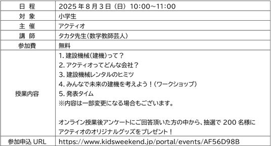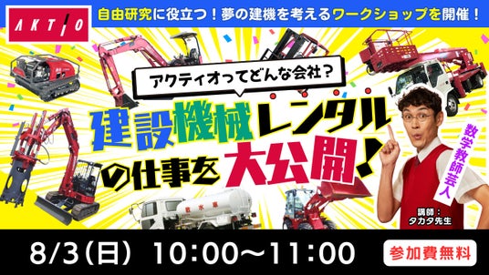 総合建設機械レンタルの株式会社アクティオ(本社:東京都中央区日本橋、代表取締役社長兼COO:小沼直人、以下アクティオ)は、日本最大級の子ども向け『教育×オンライン』プラットフォームを展開するキッズウィークエンド株式会社(本社:東京都中央区新富、代表取締役兼CEO:三浦里江)が運営する「夏のオンライン自由研究フェス2025」でオンライン授業「アクティオってどんな会社?建設機械レンタルの仕事を大公開」を2025年8月3日(日)に開催いたします。