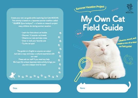 さらに本年は、インバウンド需要の高まりを受け、外国人観光客の多い一部店舗では英語版の猫図鑑をご用意。日本ならではの「自由研究」文化を体験いただく機会として、海外のお客様にもお楽しみいただける内容となっております。猫とのふれあいを通じて、国や言葉を越えて楽しめる学びの時間を、ぜひ猫カフェMOCHAでご体験ください。