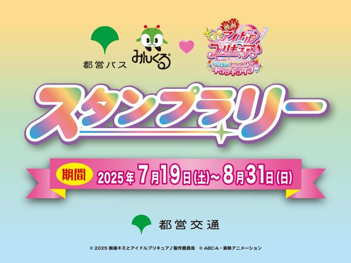 東京都交通局では、夏休みにお子様が都営バスでのおでかけを楽しんでもらえるよう、7月19日(土)から「都営バス みんくる(ハート)『映画キミとアイドルプリキュア♪お待たせ!キミに届けるキラッキライブ!』スタンプラリー」を実施します。