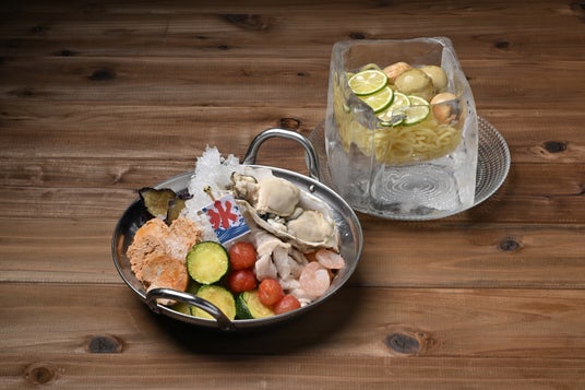 かき氷の上に、牡蠣・いくら・あん肝といった「痛風鍋」の定番食材に加え、ナス・トマト・ズッキーニなどの夏野菜を彩りよく盛り付けました。氷をくり抜いて作った器にはラーメンを盛り、さらに蟹味噌・あん肝入りの水まんじゅうを添えて提供。濃厚な豆乳ベースの胡麻担々ソースで味わう、冷たく仕立てた新感覚の一品です。