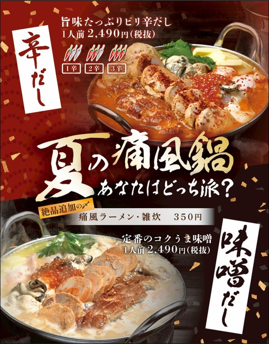 今回発売する夏季限定の「痛風鍋」は、暑い日でも箸が進むよう、異なる個性を持つ2種類をご用意しています。なかでも「夏の痛風鍋」は、北海道味噌出汁と旨辛スープの2種類のスープをご用意しており、好みに合わせてお選びいただけます。