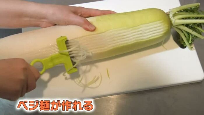 約40種類のピーラーが揃う渋谷ロフトで特に人気なのが、ヌードルピーラー。その名の通り野菜などで麺を作れるグッズで、波状の刃になっているので、角の取れた麺に近い形状でスライスすることができます。