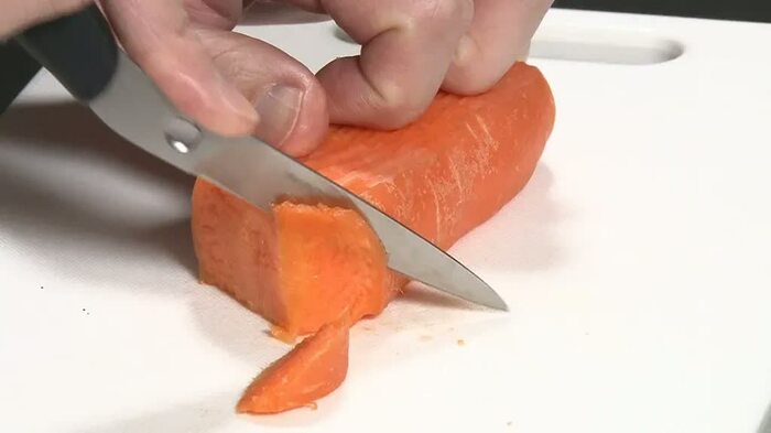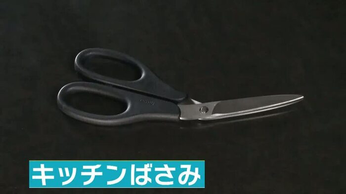 こちらのキッチンバサミはかたい食材をカットするのはもちろん、ペティナイフにもなる便利グッズです。刃の部分が分かれるようになっているのでナイフや包丁のように使えます。