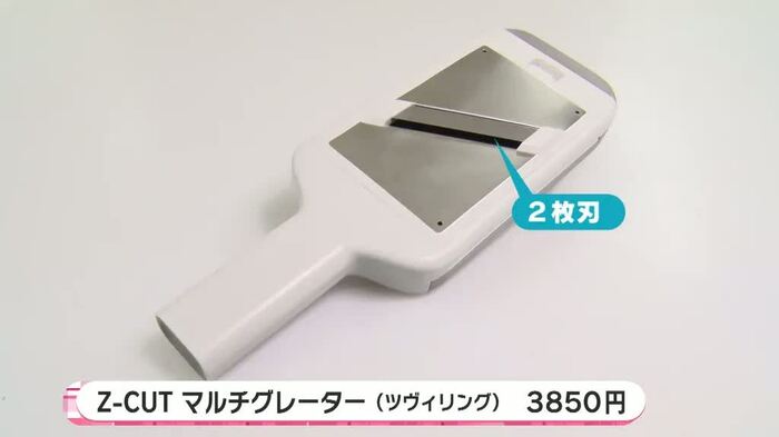 続いては、野菜を薄くスライスするときなどに使うマルチカッターの進化形です。通常刃は1枚ですが、2枚刃になって登場しました。両側から削る事ができるので2倍のスピードで料理ができます。普通は、1往復で1枚しか削れませんが、こちらは1往復で2枚削れるので調理時間を短縮できるんです。