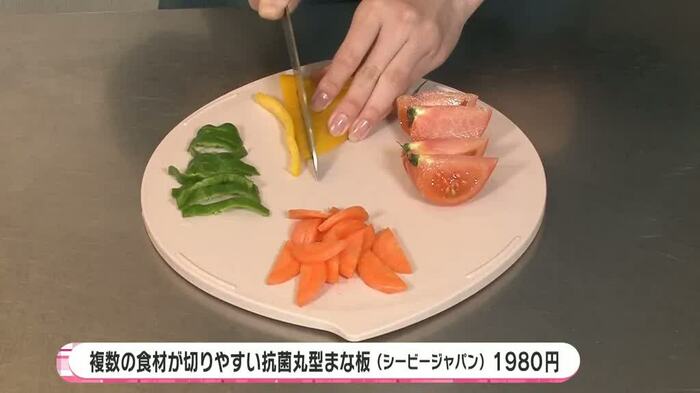 こちらのちょっと変わった丸い形のまな板は、食材を切った後にまな板を回転して使うことができるんです。1つのまな板で複数の材料を切ることができるので、何度も洗う手間が省けます。