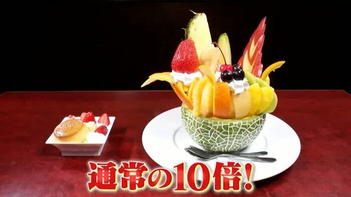 メロン型の器にシリアルとプリンを入れ、その上からアイスをプリンを見えなくなるほど盛りつけ。その上から、ホイップクリームとフルーツを10種類も詰め込み完成させます。