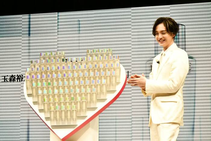 イベントの最後には、3月17日に誕生日を迎える玉森さんのために、ハート型のディスプレイに並べられた100本のクラリフィック化粧水が登場するというサプライズが。