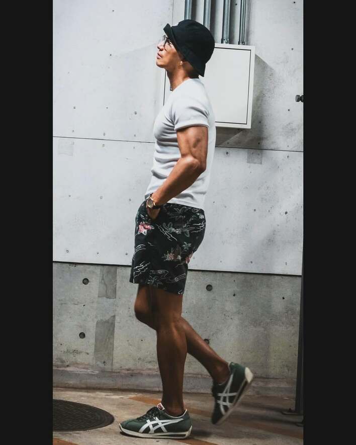 コンクリートの壁をバックに白いピタッとしたトップスと黒地に絵柄が目を引くハーフパンツ姿で黒い帽子を被った市原さんがおさめられています。