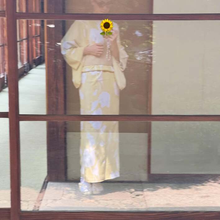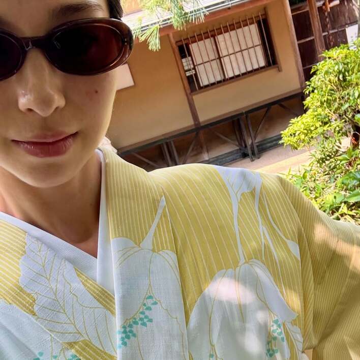 公開された写真には、和な雰囲気漂う場所で黄色の着物姿でダークブラウンのサングラスをかけた中条さんの姿が映しだされています。