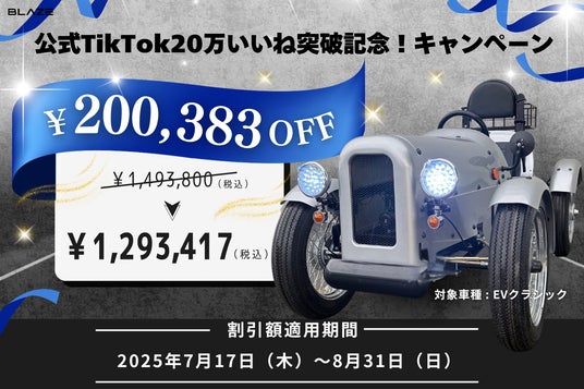 株式会社ブレイズ(本社:愛知県名古屋市、代表取締役:市川秀幸)は、2025年6月30日(月)より実施していた4輪電動ミニカーEVクラシック対象のSNS参加型割引キャンペーンにおいて、SNS上にアップしたキャンペーン専用動画に寄せられたリアクション(いいね+コメント)の総数を集計し、最終割引額を200,383円(税込)に確定したことをお知らせいたします。