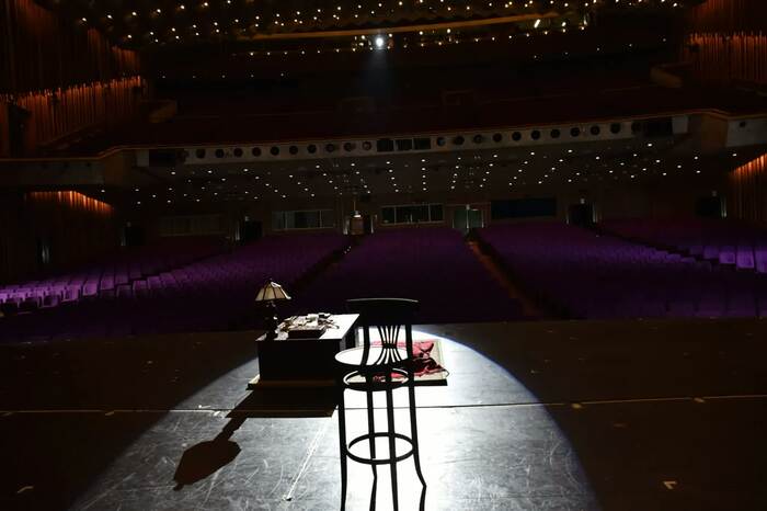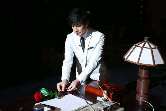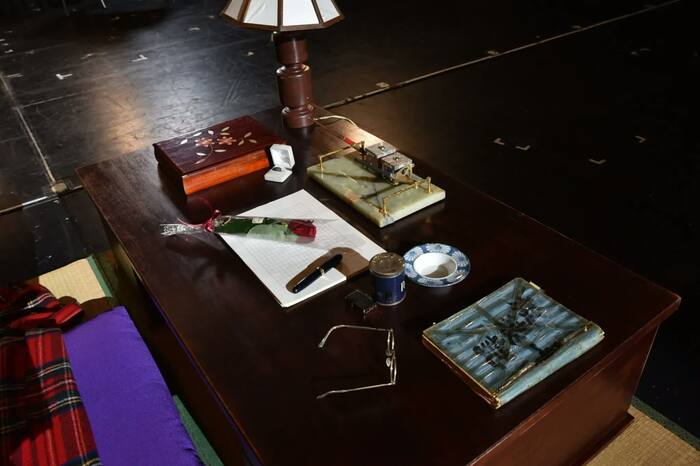 ステージには、森さんのライフワークともいえる舞台「放浪記」のラストシーンのセットが。ふみ机から、台本、眼鏡、原稿用紙などの小道具まで、森さんが実際に舞台で使用していたものです。そして、主人公の作家・林芙美子さんの遺族から譲り受けた美しい指輪も特別に飾られていました。