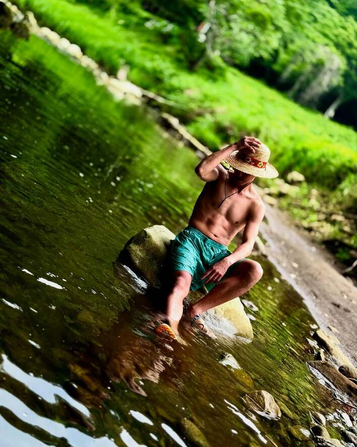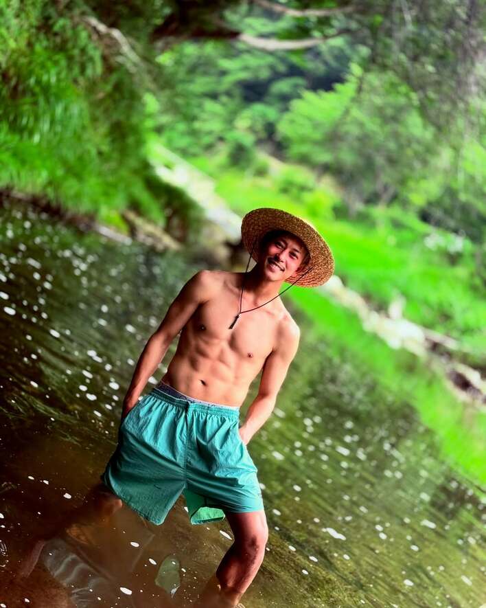 キャンプに行ったときに撮影した、川でのワイルドなキレキレ肉体ショットを披露しました。