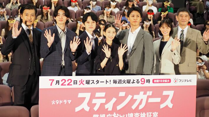 7月22日(火)にスタートする火9ドラマ『スティンガース 警視庁おとり捜査検証室』の完成披露試写会と舞台挨拶が7月17日に都内で行われ、主演の森川葵さん、共演の藤井流星(WEST.)さん、本郷奏多さん、志田彩良さん、井内悠陽さん、杉本哲太さん、玉山鉄二さんが出席しました。