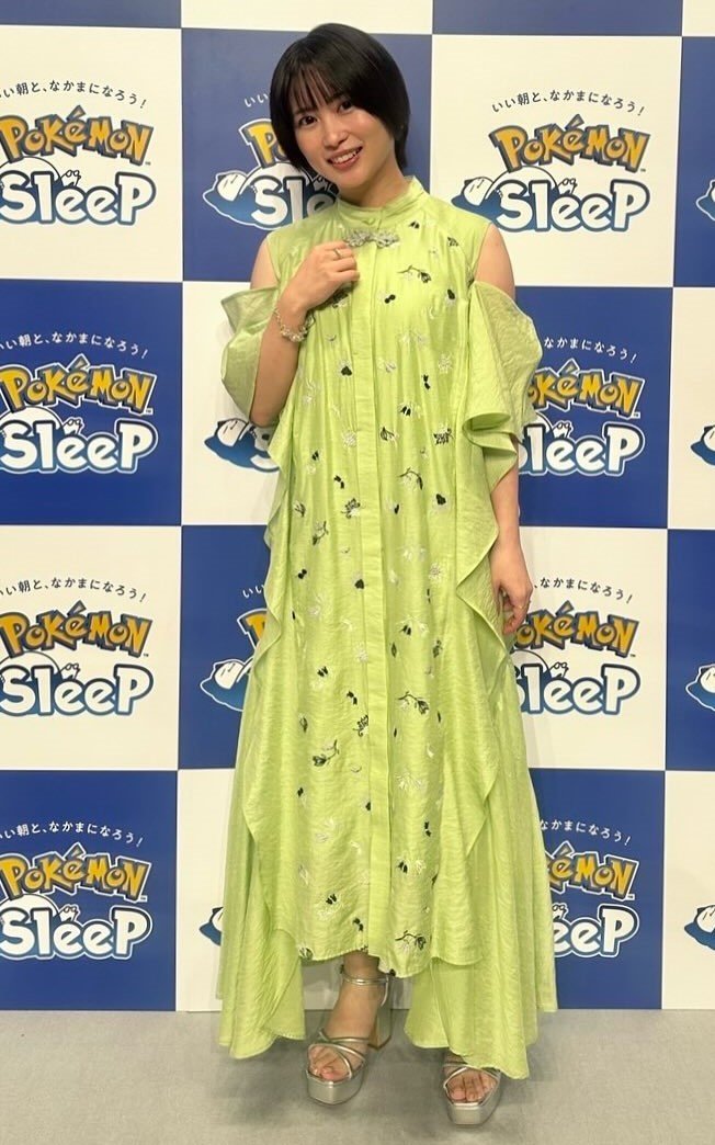「わたしの中での今日のテーマはマスカーニャでした」と衣装のテーマがポケモンだったことを明かし、肩の開いた夏らしい緑のワンピースに、シルバーのサンダルとアクセサリーを合わせたコーディネートを披露。