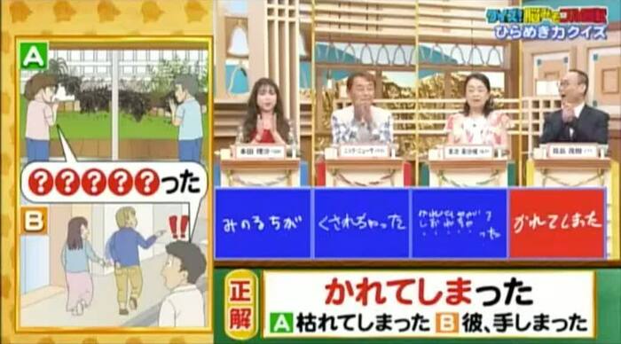 正解は「かれてしまった(枯れてしまった/彼、手しまった)」。真島さん1人が見事正解!