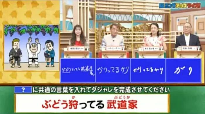 正解は「ぶどうか(ぶどう狩ってる武道家)」。正解者はなし。
