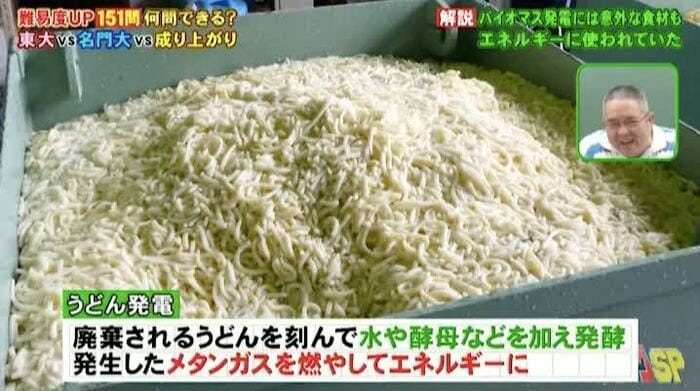 そこで導入されたのが、「うどん発電」。廃棄されるうどんを刻んで水や酵母などを加え、発酵させた際に発生するメタンガスを燃やして発電機を回して発電しているのです。