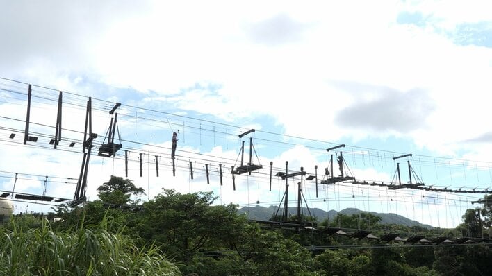 全長約84mの長い吊り橋を、ロープを頼りに“空を歩く”アトラクション『スカイエンド トレッキング』。