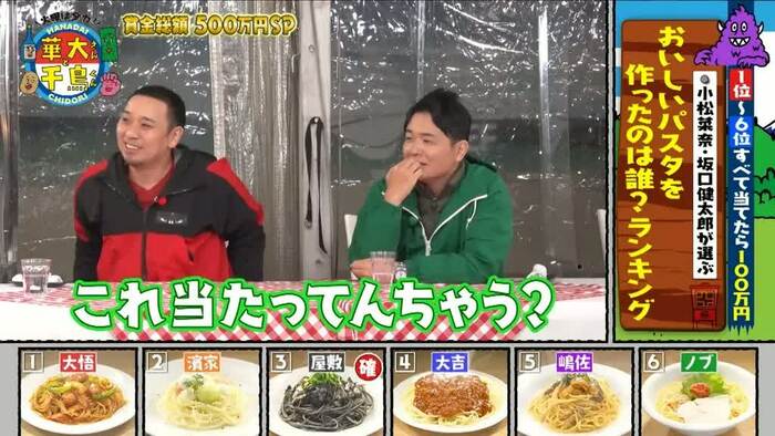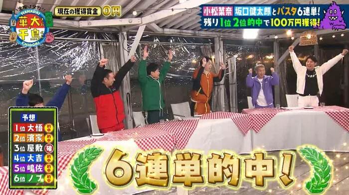 6人は、ゲストが決めた“おいしかった順”のランキングを予想し、ピッタリ当てることができれば100万円を獲得できます。進行役は、近藤春菜(ハリセンボン)さんが務めました。