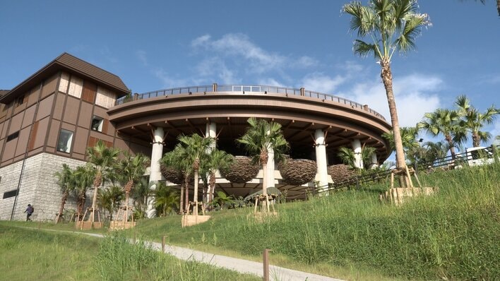 緑豊かな場所に建っているのが『PANORAMA DINING パノラマダイニング』。ヤシの木が立っていて南国感があふれています。