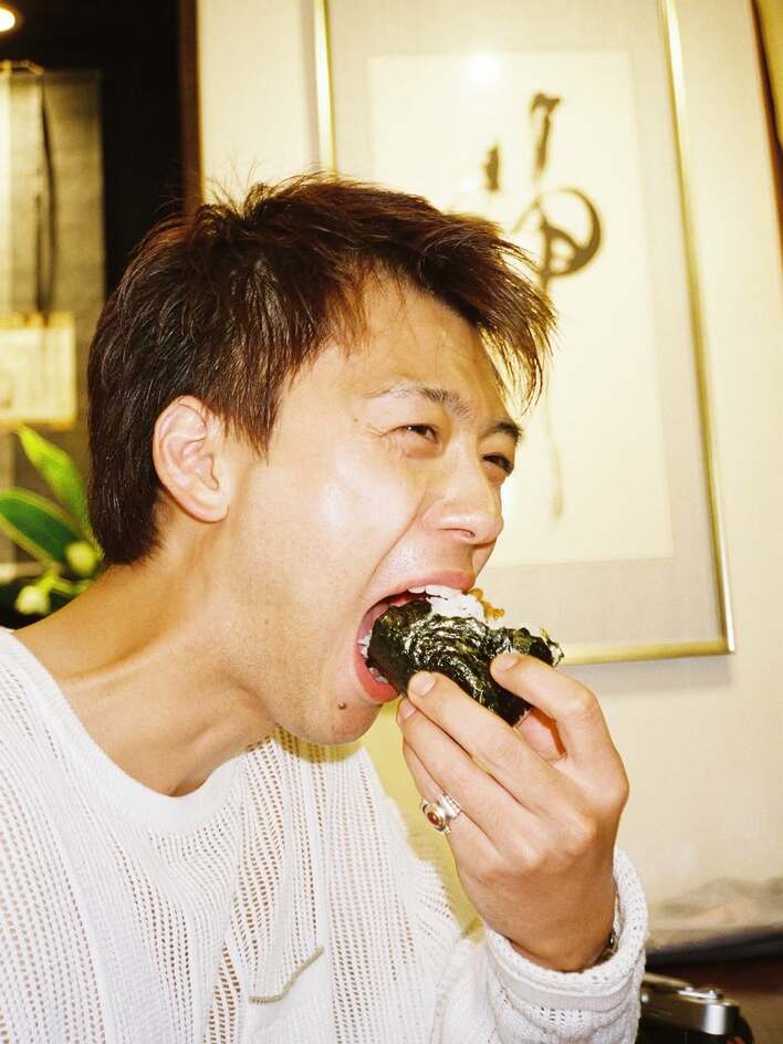 1枚目の写真には、無我夢中で“おにぎり”を頬張る竹内さんの姿が!