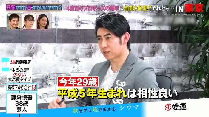 ここまでのシウマさんの話を聞き、藤森さんが自身の恋愛運についてさらに質問する場面も。実は、仲がいいという「5日生まれの女性芸能人」がいるそうで…?この続きは無料見逃し配信中の『突然ですが占ってもいいですか?』でチェックしてみてください。
