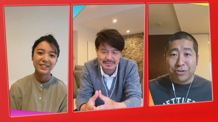 自宅でパソコンなどによるリモートシステムを使ってトークをおこなうMCの3人。収録日の1週間前に出演のオファーがあったことが明かされる中、MC3人とも、完全なリモートでの収録は今回が初めてだという。