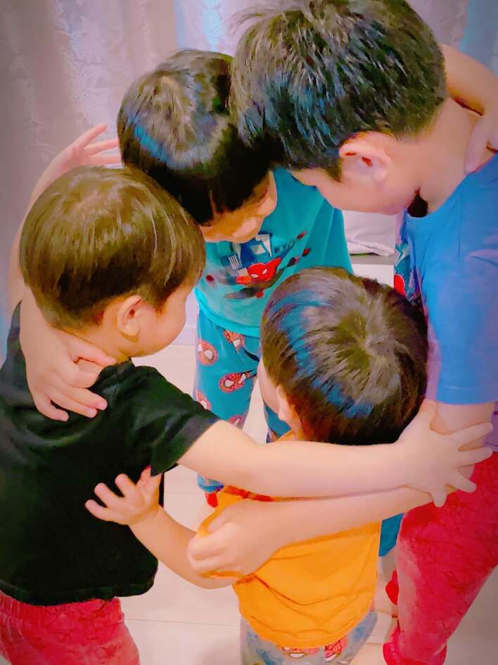 「PAPAの応援隊」というコメントと共に投稿された写真には、4兄弟が互いの肩に手を添え円陣を組む姿が!身体をぐっと寄せ合い、互いに視線を合わせる姿は、なんとも ほほ笑ましく癒されます。