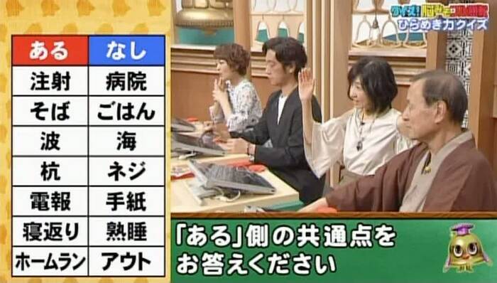次は、あるなしクイズ。次の単語の「ある」側の共通点を答えてください。