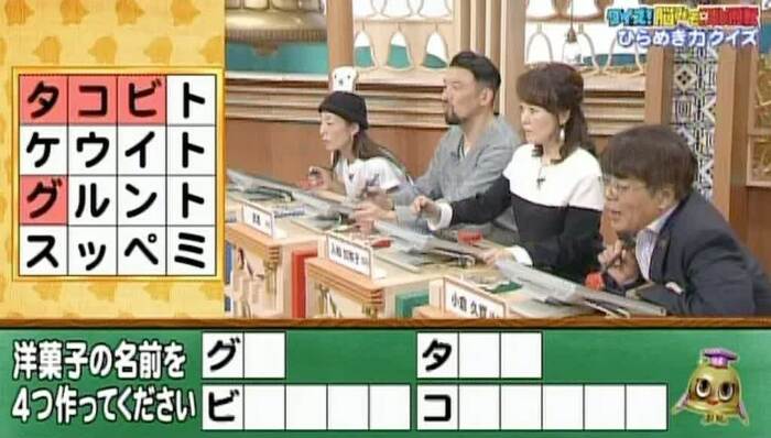 ヒント。4つの洋菓子の最初の文字はそれぞれ「グ」「タ」「ビ」「コ」となります。