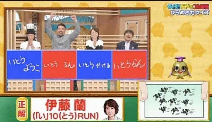 正解は「伊藤蘭(『い』が10個、走る=RUN)」。武蔵さん、再び歓喜の雄叫び!