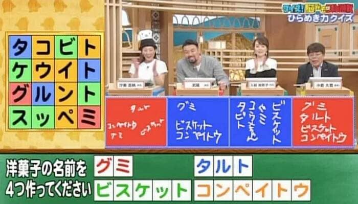 正解は「グミ」「タルト」「ビルケット」「コンペイトウ」。汐美さんと小倉さんが正解!