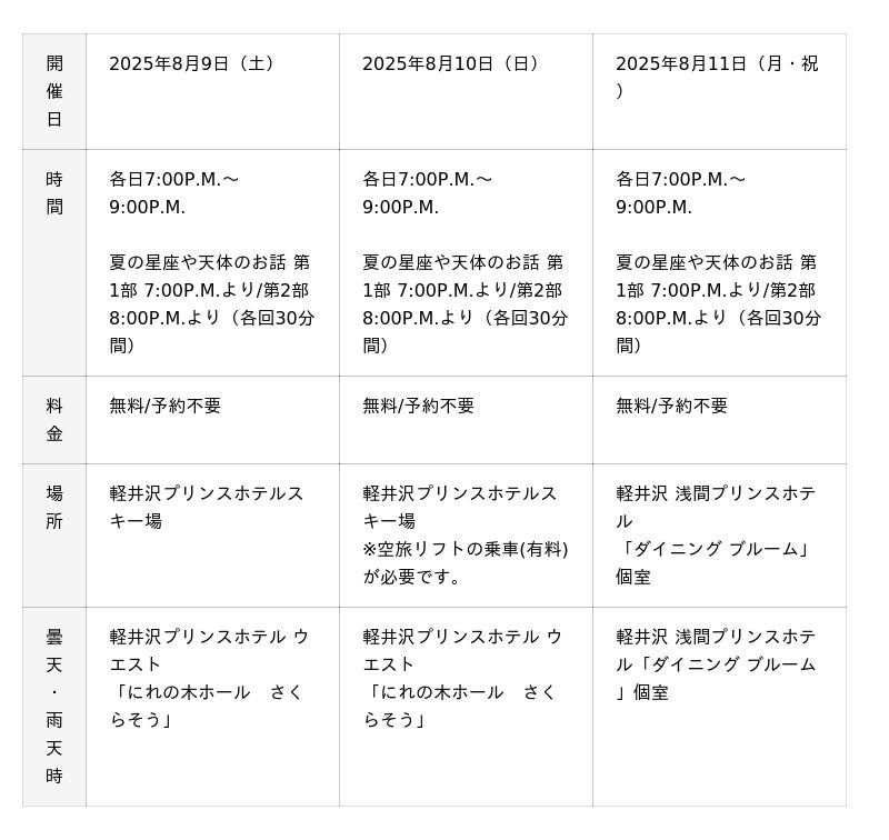 プリンスグランドリゾート軽井沢(所在地:長野県北佐久郡軽井沢町、総支配人:影山裕子)の軽井沢プリンスホテルスキー場と軽井沢 浅間プリンスホテルでは、専門家による星座や天体の解説イベント「星空観望会」を2025年8月9日(土)~11日(月・祝)の3日間開催します。さらに、8月10日(日)は「サンセット&ナイト 空旅リフト」を運行し、星空にちなんださまざまなイベントをスキー場山頂で同時開催します。