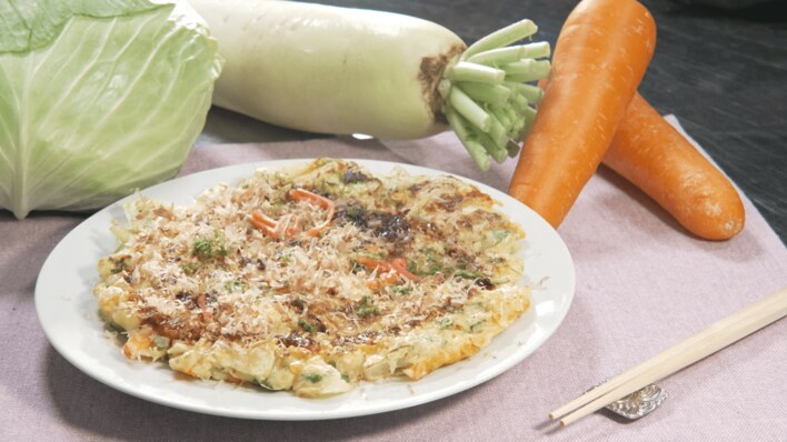 その上に、紅しょうが、かつお節、ソース、青のりをかけたら栄養満点の「野菜たっぷりお好み焼き」の完成です。
