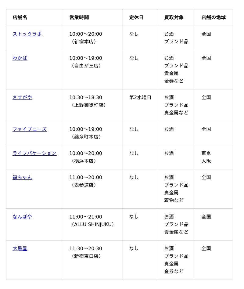 では、シャンパン買取におすすめの業者紹介に進みましょう。まずは、各業者の主要情報をまとめた一覧表からご確認ください。