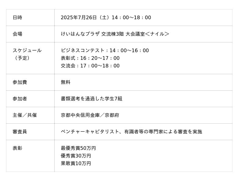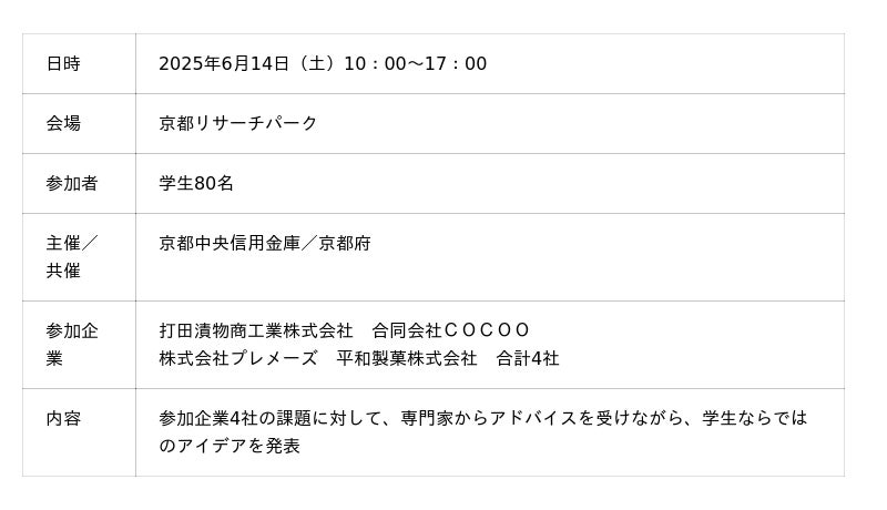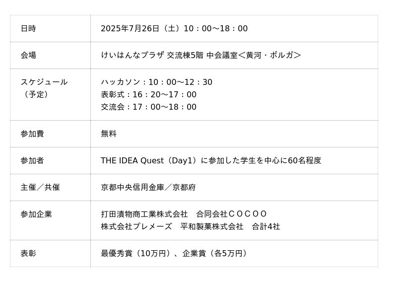 京都スタートアップ・エコシステム推進協議会の構成団体である京都中央信用金庫(理事長 植村 幸弘)では、京都府や各大学と連携し、次代を担う起業家の育成及びアントレプレナーシップの醸成を図る学生プログラム「IDEA BANK presented by 京都中央信用金庫」内のイベントとして、産学公が連携した「THE IDEA Quest」(アイデアソン・ハッカソン)及び「THE IDEA Arena」(学生ビジネスコンテスト)を下記の概要で開催しますので、お知らせします。